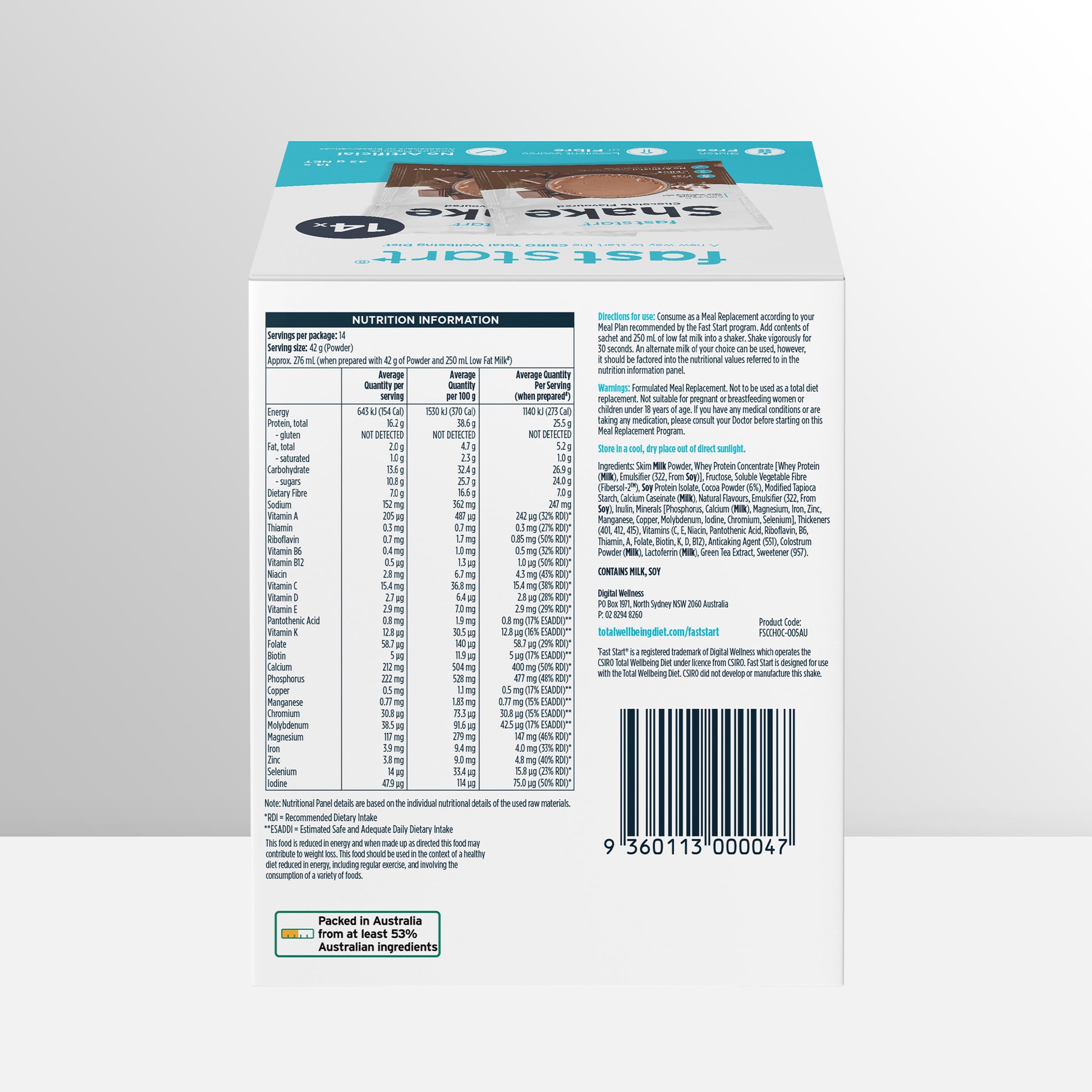 Our Fast Start Chocolate Shakes are ideal if you'd like to try the new Fast Start Program or need a top-up supply of meal replacements while transitioning to the CSIRO Total Wellbeing Diet. Each pack includes: